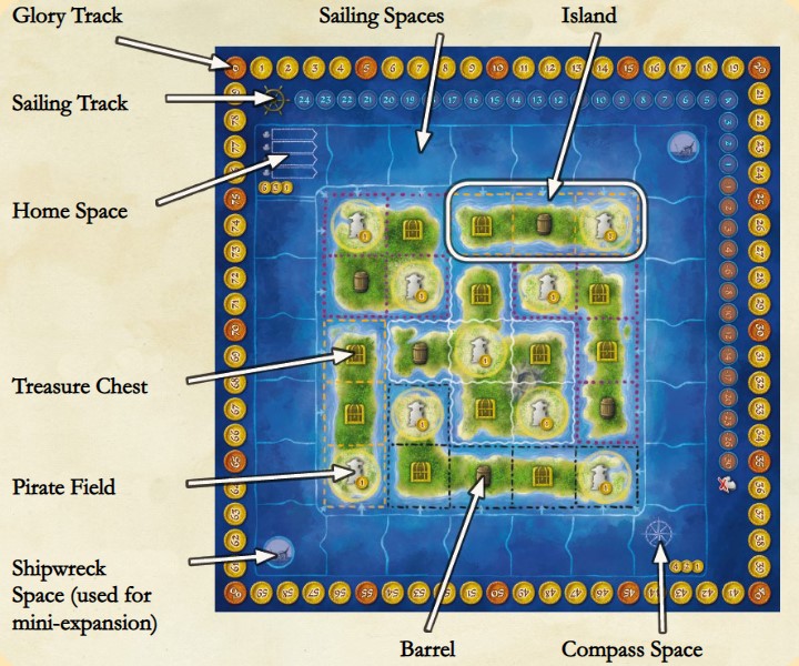 where they are placed, pirates may receive glory, treasure tokens, or