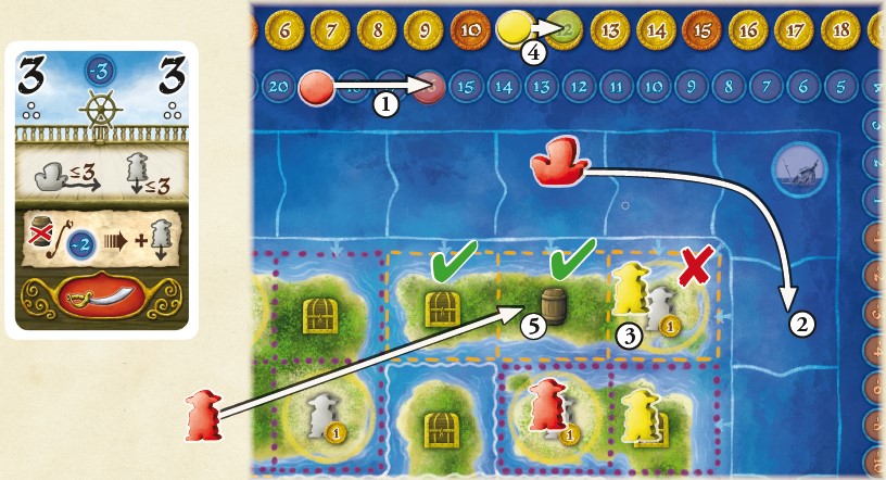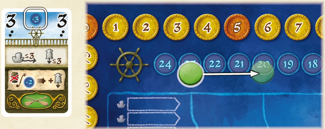 Each player moves their disc a number of spaces on the sailing track equal to the number of sailing points printed on the card.
