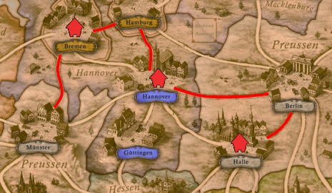 or he places 1 house on Preußen (Halle, Berlin or Münster), 1 house on Hannover, and 1 house on one of the free cities (Hamburg or Bremen).