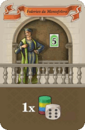 In Lorenzo il Magnifico, each player takes the role of a head of a noble family in Florence during the Renaissance. You must accumulate prestige and fame to gain more Victory Points than the others. To do so, you will send your family members to different areas of the city where they can attain various achievements. In some areas, you will get useful resources. In others, you will get development cards representing new territories, sponsored buildings, influenced characters or encouraged ventures. Elsewhere, you can activate the effects of these cards. Family members are not identical. At the beginning of each round, 3 dice are rolled to determine the family members’ value. You must carefully choose where to send your family members with a higher value.