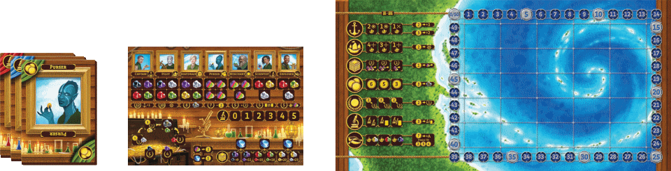 2. Each player chooses a color and takes the components in his color: 1 cabin, 7 crew cards, 1 ship, 5 action markers, 1 scoring marker. The color of the cabins is shown by the liquid in the glass jars.